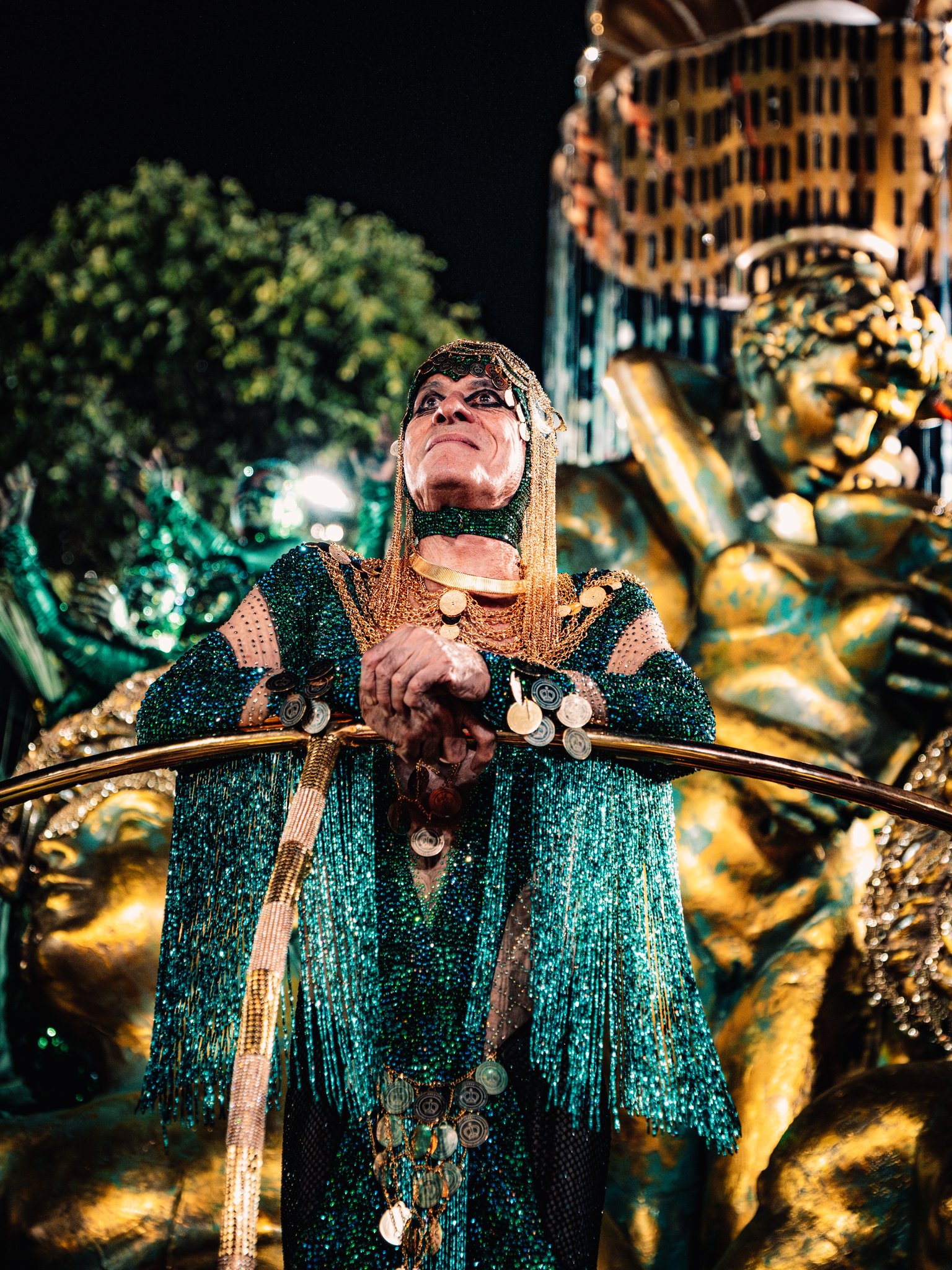 Vestido de verde e dourado, o artista surgiu no último carro, onde também estavam personalidades convidadas por ele, incluindo Jesuita Barbosa (que o interpretou no excelente Homem com H, de 2025), a atriz Maitê Proença e a jornalista Sarah Oliveira.