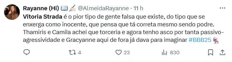 Muitos apontam que ela se aliou ao grupo errado na casa e outros dizem que ela é grosseira e tóxica com Mateus Pires, amigo com quem faz dupla na atração.