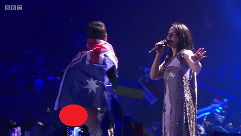 Intruso mostra a bunda durante performance no Eurovision e cantora mantém a pose