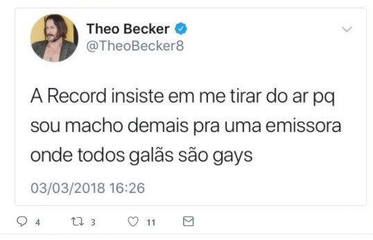Em seu Twitter, o ator escreveu, na tarde deste sábado 3: "A Record insiste em me tirar do ar pq sou macho demais pra uma emissora onde todos galãs são gays".